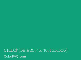 CIELCh 58.926,46.46,165.506 Color is a normal green color and the nearest color is Gossamer #069b81. Hex code #0fa178 and RGB value is rgb(15,161,120). In RGB color space, this color is composed of 6% red, 63% green, 47% blue, In CMYK color space, this color is composed of 91% cyan, 0% magenta, 25% yellow , 37% black , In HSL color space, this color has a hue angle of 163° , 83% saturation and 35% lightness.
