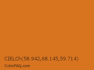 CIELCh 58.942,68.145,59.714 Color is a normal orange color and the nearest color is Hot Cinnamon #d2691e. Hex code #d87320 and RGB value is rgb(216,115,32). In RGB color space, this color is composed of 85% red, 45% green, 13% blue, In CMYK color space, this color is composed of 0% cyan, 47% magenta, 85% yellow , 15% black , In HSL color space, this color has a hue angle of 27° , 74% saturation and 49% lightness.