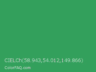 CIELCh 58.943,54.012,149.866 Color is a normal green color and the nearest color is Chateau Green #40a860. Hex code #33a15c and RGB value is rgb(51,161,92). In RGB color space, this color is composed of 20% red, 63% green, 36% blue, In CMYK color space, this color is composed of 68% cyan, 0% magenta, 43% yellow , 37% black , In HSL color space, this color has a hue angle of 142° , 52% saturation and 42% lightness.