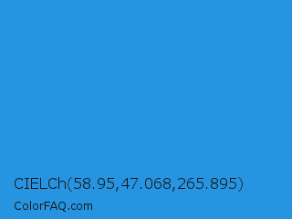 CIELCh 58.95,47.068,265.895 Color is a normal blue color and the nearest color is Curious Blue #2596d1. Hex code #2694e0 and RGB value is rgb(38,148,224). In RGB color space, this color is composed of 15% red, 58% green, 88% blue, In CMYK color space, this color is composed of 83% cyan, 34% magenta, 0% yellow , 12% black , In HSL color space, this color has a hue angle of 205° , 75% saturation and 51% lightness.