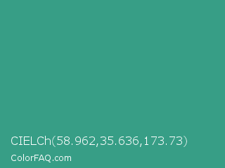 CIELCh 58.962,35.636,173.73 Color is a normal cyan color and the nearest color is Zomp #39a78e. Hex code #379e86 and RGB value is rgb(55,158,134). In RGB color space, this color is composed of 22% red, 62% green, 53% blue, In CMYK color space, this color is composed of 65% cyan, 0% magenta, 15% yellow , 38% black , In HSL color space, this color has a hue angle of 166° , 48% saturation and 42% lightness.