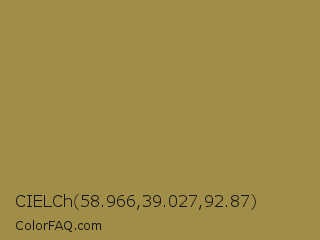 CIELCh 58.966,39.027,92.87 Color is a normal yellow color and the nearest color is Driftwood #af8751. Hex code #a08d48 and RGB value is rgb(160,141,72). In RGB color space, this color is composed of 63% red, 55% green, 28% blue, In CMYK color space, this color is composed of 0% cyan, 12% magenta, 55% yellow , 37% black , In HSL color space, this color has a hue angle of 47° , 38% saturation and 45% lightness.