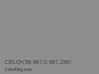 CIELCh 58.967,0.687,256 Color is a normal blue color and the nearest color is Stack #8a8f8a. Hex code #8d8e8f and RGB value is rgb(141,142,143). In RGB color space, this color is composed of 55% red, 56% green, 56% blue, In CMYK color space, this color is composed of 1% cyan, 1% magenta, 0% yellow , 44% black , In HSL color space, this color has a hue angle of 210° , 1% saturation and 56% lightness.