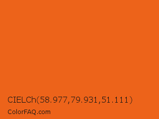 CIELCh 58.977,79.931,51.111 Color is a normal orange color and the nearest color is Vivid Vermilion #e56024. Hex code #ed631a and RGB value is rgb(237,99,26). In RGB color space, this color is composed of 93% red, 39% green, 10% blue, In CMYK color space, this color is composed of 0% cyan, 58% magenta, 89% yellow , 7% black , In HSL color space, this color has a hue angle of 21° , 85% saturation and 52% lightness.
