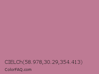 CIELCh 58.978,30.29,354.413 Color is a light rose color and the nearest color is English Lavender #b48395. Hex code #be7a94 and RGB value is rgb(190,122,148). In RGB color space, this color is composed of 75% red, 48% green, 58% blue, In CMYK color space, this color is composed of 0% cyan, 36% magenta, 22% yellow , 25% black , In HSL color space, this color has a hue angle of 337° , 34% saturation and 61% lightness.