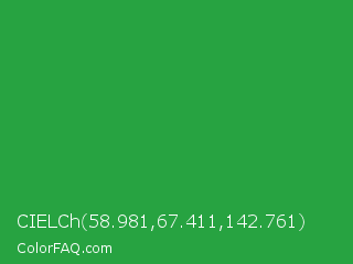 CIELCh 58.981,67.411,142.761 Color is a normal green color and the nearest color is Wageningen Green #34b233. Hex code #27a341 and RGB value is rgb(39,163,65). In RGB color space, this color is composed of 15% red, 64% green, 25% blue, In CMYK color space, this color is composed of 76% cyan, 0% magenta, 60% yellow , 36% black , In HSL color space, this color has a hue angle of 133° , 61% saturation and 40% lightness.