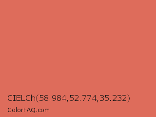 CIELCh 58.984,52.774,35.232 Color is a light red color and the nearest color is Terracotta #e2725b. Hex code #de6c5b and RGB value is rgb(222,108,91). In RGB color space, this color is composed of 87% red, 42% green, 36% blue, In CMYK color space, this color is composed of 0% cyan, 51% magenta, 59% yellow , 13% black , In HSL color space, this color has a hue angle of 8° , 66% saturation and 61% lightness.