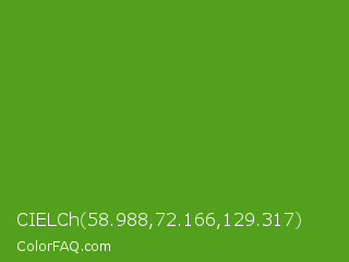 CIELCh 58.988,72.166,129.317 Color is a normal green color and the nearest color is Vida Loca #549019. Hex code #52a01b and RGB value is rgb(82,160,27). In RGB color space, this color is composed of 32% red, 63% green, 11% blue, In CMYK color space, this color is composed of 49% cyan, 0% magenta, 83% yellow , 37% black , In HSL color space, this color has a hue angle of 95° , 71% saturation and 37% lightness.