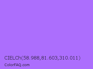 CIELCh 58.988,81.603,310.011 Color is a light violet color and the nearest color is Lavender #b57edc. Hex code #ac6efd and RGB value is rgb(172,110,253). In RGB color space, this color is composed of 67% red, 43% green, 99% blue, In CMYK color space, this color is composed of 32% cyan, 57% magenta, 0% yellow , 1% black , In HSL color space, this color has a hue angle of 266° , 97% saturation and 71% lightness.