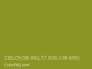 CIELCh 58.992,57.639,108.659 Color is a normal yellow color and the nearest color is Trendy Green #7c881a. Hex code #8a9523 and RGB value is rgb(138,149,35). In RGB color space, this color is composed of 54% red, 58% green, 14% blue, In CMYK color space, this color is composed of 7% cyan, 0% magenta, 77% yellow , 42% black , In HSL color space, this color has a hue angle of 66° , 62% saturation and 36% lightness.