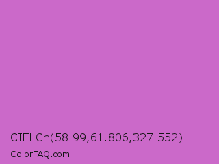 CIELCh 58.99,61.806,327.552 Color is a normal magenta color and the nearest color is French Mauve #d473d4. Hex code #cb69c9 and RGB value is rgb(203,105,201). In RGB color space, this color is composed of 80% red, 41% green, 79% blue, In CMYK color space, this color is composed of 0% cyan, 48% magenta, 1% yellow , 20% black , In HSL color space, this color has a hue angle of 301° , 49% saturation and 60% lightness.
