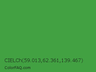 CIELCh 59.013,62.361,139.467 Color is a normal green color and the nearest color is Apple #4fa83d. Hex code #42a142 and RGB value is rgb(66,161,66). In RGB color space, this color is composed of 26% red, 63% green, 26% blue, In CMYK color space, this color is composed of 59% cyan, 0% magenta, 59% yellow , 37% black , In HSL color space, this color has a hue angle of 120° , 42% saturation and 45% lightness.