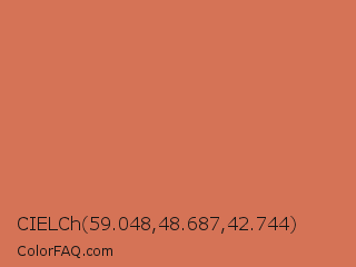 CIELCh 59.048,48.687,42.744 Color is a normal red color and the nearest color is Copper Red #cb6d51. Hex code #d57356 and RGB value is rgb(213,115,86). In RGB color space, this color is composed of 84% red, 45% green, 34% blue, In CMYK color space, this color is composed of 0% cyan, 46% magenta, 60% yellow , 16% black , In HSL color space, this color has a hue angle of 14° , 60% saturation and 59% lightness.