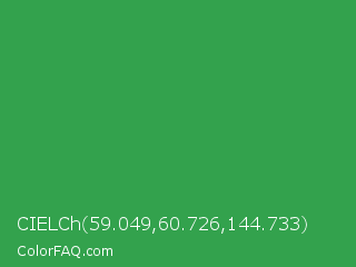 CIELCh 59.049,60.726,144.733 Color is a normal green color and the nearest color is Chateau Green #40a860. Hex code #33a24d and RGB value is rgb(51,162,77). In RGB color space, this color is composed of 20% red, 64% green, 30% blue, In CMYK color space, this color is composed of 69% cyan, 0% magenta, 52% yellow , 36% black , In HSL color space, this color has a hue angle of 134° , 52% saturation and 42% lightness.