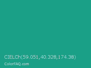 CIELCh 59.051,40.328,174.38 Color is a normal cyan color and the nearest color is Green Crayola #1cac78. Hex code #1aa086 and RGB value is rgb(26,160,134). In RGB color space, this color is composed of 10% red, 63% green, 53% blue, In CMYK color space, this color is composed of 84% cyan, 0% magenta, 16% yellow , 37% black , In HSL color space, this color has a hue angle of 168° , 72% saturation and 36% lightness.