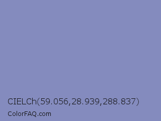 CIELCh 59.056,28.939,288.837 Color is a light blue color and the nearest color is Wild Blue Yonder #7a89b8. Hex code #848bbe and RGB value is rgb(132,139,190). In RGB color space, this color is composed of 52% red, 55% green, 75% blue, In CMYK color space, this color is composed of 31% cyan, 27% magenta, 0% yellow , 25% black , In HSL color space, this color has a hue angle of 233° , 31% saturation and 63% lightness.