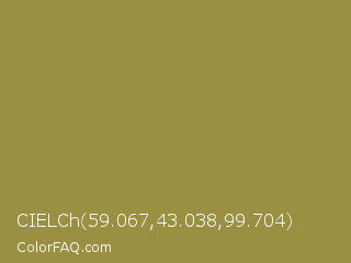 CIELCh 59.067,43.038,99.704 Color is a normal yellow color and the nearest color is Sycamore #908d39. Hex code #999041 and RGB value is rgb(153,144,65). In RGB color space, this color is composed of 60% red, 56% green, 25% blue, In CMYK color space, this color is composed of 0% cyan, 6% magenta, 58% yellow , 40% black , In HSL color space, this color has a hue angle of 54° , 40% saturation and 43% lightness.