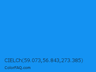 CIELCh 59.073,56.843,273.385 Color is a normal blue color and the nearest color is Dodger Blue #1e90ff. Hex code #1392f2 and RGB value is rgb(19,146,242). In RGB color space, this color is composed of 7% red, 57% green, 95% blue, In CMYK color space, this color is composed of 92% cyan, 40% magenta, 0% yellow , 5% black , In HSL color space, this color has a hue angle of 206° , 90% saturation and 51% lightness.