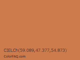 CIELCh 59.089,47.377,54.873 Color is a normal orange color and the nearest color is Raw Sienna Crayola #d27d46. Hex code #cb7a4b and RGB value is rgb(203,122,75). In RGB color space, this color is composed of 80% red, 48% green, 29% blue, In CMYK color space, this color is composed of 0% cyan, 40% magenta, 63% yellow , 20% black , In HSL color space, this color has a hue angle of 22° , 55% saturation and 55% lightness.