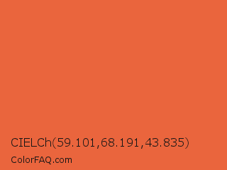 CIELCh 59.101,68.191,43.835 Color is a normal red color and the nearest color is Red Damask #da6a41. Hex code #ea653d and RGB value is rgb(234,101,61). In RGB color space, this color is composed of 92% red, 40% green, 24% blue, In CMYK color space, this color is composed of 0% cyan, 57% magenta, 74% yellow , 8% black , In HSL color space, this color has a hue angle of 14° , 80% saturation and 58% lightness.