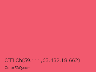 CIELCh 59.111,63.432,18.662 Color is a light red color and the nearest color is Fiery Rose #ff5470. Hex code #f2596e and RGB value is rgb(242,89,110). In RGB color space, this color is composed of 95% red, 35% green, 43% blue, In CMYK color space, this color is composed of 0% cyan, 63% magenta, 55% yellow , 5% black , In HSL color space, this color has a hue angle of 352° , 85% saturation and 65% lightness.