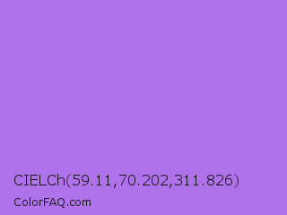 CIELCh 59.11,70.202,311.826 Color is a light violet color and the nearest color is Lavender #b57edc. Hex code #af72eb and RGB value is rgb(175,114,235). In RGB color space, this color is composed of 69% red, 45% green, 92% blue, In CMYK color space, this color is composed of 26% cyan, 51% magenta, 0% yellow , 8% black , In HSL color space, this color has a hue angle of 270° , 75% saturation and 68% lightness.