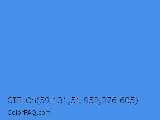 CIELCh 59.131,51.952,276.605 Color is a normal blue color and the nearest color is Tufts Blue #3e8ede. Hex code #4790e9 and RGB value is rgb(71,144,233). In RGB color space, this color is composed of 28% red, 56% green, 91% blue, In CMYK color space, this color is composed of 70% cyan, 38% magenta, 0% yellow , 9% black , In HSL color space, this color has a hue angle of 213° , 79% saturation and 60% lightness.