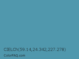 CIELCh 59.14,24.342,227.278 Color is a normal blue color and the nearest color is Hippie Blue #589aaf. Hex code #5098ad and RGB value is rgb(80,152,173). In RGB color space, this color is composed of 31% red, 60% green, 68% blue, In CMYK color space, this color is composed of 54% cyan, 12% magenta, 0% yellow , 32% black , In HSL color space, this color has a hue angle of 194° , 37% saturation and 50% lightness.