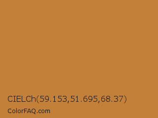 CIELCh 59.153,51.695,68.37 Color is a normal orange color and the nearest color is Bronze #cd7f32. Hex code #c28038 and RGB value is rgb(194,128,56). In RGB color space, this color is composed of 76% red, 50% green, 22% blue, In CMYK color space, this color is composed of 0% cyan, 34% magenta, 71% yellow , 24% black , In HSL color space, this color has a hue angle of 31° , 55% saturation and 49% lightness.