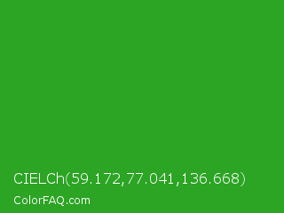 CIELCh 59.172,77.041,136.668 Color is a normal green color and the nearest color is Slimy Green #299617. Hex code #2ca424 and RGB value is rgb(44,164,36). In RGB color space, this color is composed of 17% red, 64% green, 14% blue, In CMYK color space, this color is composed of 73% cyan, 0% magenta, 78% yellow , 36% black , In HSL color space, this color has a hue angle of 116° , 64% saturation and 39% lightness.