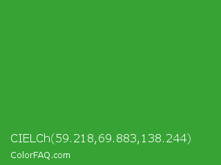 CIELCh 59.218,69.883,138.244 Color is a normal green color and the nearest color is Wageningen Green #34b233. Hex code #37a335 and RGB value is rgb(55,163,53). In RGB color space, this color is composed of 22% red, 64% green, 21% blue, In CMYK color space, this color is composed of 66% cyan, 0% magenta, 67% yellow , 36% black , In HSL color space, this color has a hue angle of 119° , 51% saturation and 42% lightness.
