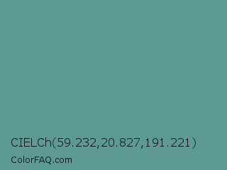 CIELCh 59.232,20.827,191.221 Color is a normal cyan color and the nearest color is Patina #639a8f. Hex code #5d9995 and RGB value is rgb(93,153,149). In RGB color space, this color is composed of 36% red, 60% green, 58% blue, In CMYK color space, this color is composed of 39% cyan, 0% magenta, 3% yellow , 40% black , In HSL color space, this color has a hue angle of 176° , 24% saturation and 48% lightness.