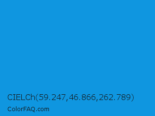 CIELCh 59.247,46.866,262.789 Color is a normal blue color and the nearest color is Rich Electric Blue #0892d0. Hex code #0f96e0 and RGB value is rgb(15,150,224). In RGB color space, this color is composed of 6% red, 59% green, 88% blue, In CMYK color space, this color is composed of 93% cyan, 33% magenta, 0% yellow , 12% black , In HSL color space, this color has a hue angle of 201° , 87% saturation and 47% lightness.