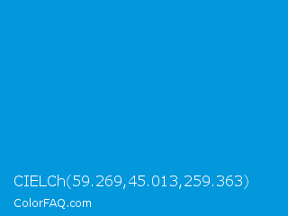 CIELCh 59.269,45.013,259.363 Color is a normal blue color and the nearest color is Rich Electric Blue #0892d0. Hex code #0397dc and RGB value is rgb(3,151,220). In RGB color space, this color is composed of 1% red, 59% green, 86% blue, In CMYK color space, this color is composed of 99% cyan, 31% magenta, 0% yellow , 14% black , In HSL color space, this color has a hue angle of 199° , 97% saturation and 44% lightness.