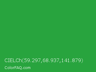 CIELCh 59.297,68.937,141.879 Color is a normal green color and the nearest color is Wageningen Green #34b233. Hex code #28a43e and RGB value is rgb(40,164,62). In RGB color space, this color is composed of 16% red, 64% green, 24% blue, In CMYK color space, this color is composed of 76% cyan, 0% magenta, 62% yellow , 36% black , In HSL color space, this color has a hue angle of 131° , 61% saturation and 40% lightness.