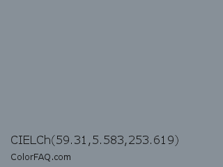 CIELCh 59.31,5.583,253.619 Color is a normal blue color and the nearest color is Oslo Gray #878d91. Hex code #879098 and RGB value is rgb(135,144,152). In RGB color space, this color is composed of 53% red, 56% green, 60% blue, In CMYK color space, this color is composed of 11% cyan, 5% magenta, 0% yellow , 40% black , In HSL color space, this color has a hue angle of 208° , 8% saturation and 56% lightness.