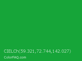 CIELCh 59.321,72.744,142.027 Color is a normal green color and the nearest color is Green Pantone #00ad43. Hex code #16a539 and RGB value is rgb(22,165,57). In RGB color space, this color is composed of 9% red, 65% green, 22% blue, In CMYK color space, this color is composed of 87% cyan, 0% magenta, 65% yellow , 35% black , In HSL color space, this color has a hue angle of 135° , 76% saturation and 37% lightness.
