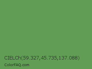 CIELCh 59.327,45.735,137.088 Color is a normal green color and the nearest color is Fruit Salad #4f9d5d. Hex code #629d56 and RGB value is rgb(98,157,86). In RGB color space, this color is composed of 38% red, 62% green, 34% blue, In CMYK color space, this color is composed of 38% cyan, 0% magenta, 45% yellow , 38% black , In HSL color space, this color has a hue angle of 110° , 29% saturation and 48% lightness.