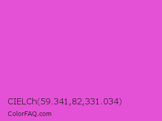 CIELCh 59.341,82,331.034 Color is a light magenta color and the nearest color is Purple Pizzazz #fe4eda. Hex code #e551d6 and RGB value is rgb(229,81,214). In RGB color space, this color is composed of 90% red, 32% green, 84% blue, In CMYK color space, this color is composed of 0% cyan, 65% magenta, 7% yellow , 10% black , In HSL color space, this color has a hue angle of 306° , 74% saturation and 61% lightness.