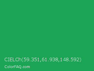 CIELCh 59.351,61.938,148.592 Color is a normal green color and the nearest color is Green Pigment #00a550. Hex code #1ba453 and RGB value is rgb(27,164,83). In RGB color space, this color is composed of 11% red, 64% green, 33% blue, In CMYK color space, this color is composed of 84% cyan, 0% magenta, 49% yellow , 36% black , In HSL color space, this color has a hue angle of 145° , 72% saturation and 37% lightness.