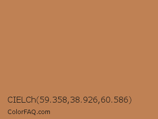 CIELCh 59.358,38.926,60.586 Color is a normal orange color and the nearest color is Deer #ba8759. Hex code #bf8154 and RGB value is rgb(191,129,84). In RGB color space, this color is composed of 75% red, 51% green, 33% blue, In CMYK color space, this color is composed of 0% cyan, 32% magenta, 56% yellow , 25% black , In HSL color space, this color has a hue angle of 25° , 46% saturation and 54% lightness.