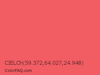 CIELCh 59.372,64.027,24.948 Color is a light red color and the nearest color is Carnation #f95a61. Hex code #f25c63 and RGB value is rgb(242,92,99). In RGB color space, this color is composed of 95% red, 36% green, 39% blue, In CMYK color space, this color is composed of 0% cyan, 62% magenta, 59% yellow , 5% black , In HSL color space, this color has a hue angle of 357° , 85% saturation and 65% lightness.