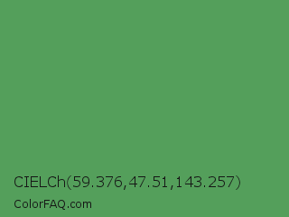 CIELCh 59.376,47.51,143.257 Color is a normal green color and the nearest color is Fruit Salad #4f9d5d. Hex code #549f5b and RGB value is rgb(84,159,91). In RGB color space, this color is composed of 33% red, 62% green, 36% blue, In CMYK color space, this color is composed of 47% cyan, 0% magenta, 43% yellow , 38% black , In HSL color space, this color has a hue angle of 126° , 31% saturation and 48% lightness.