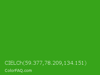 CIELCh 59.377,78.209,134.151 Color is a normal green color and the nearest color is Slimy Green #299617. Hex code #37a41a and RGB value is rgb(55,164,26). In RGB color space, this color is composed of 22% red, 64% green, 10% blue, In CMYK color space, this color is composed of 66% cyan, 0% magenta, 84% yellow , 36% black , In HSL color space, this color has a hue angle of 107° , 73% saturation and 37% lightness.