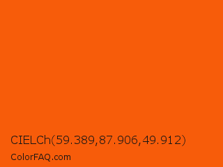 CIELCh 59.389,87.906,49.912 Color is a normal orange color and the nearest color is Willpower Orange #fd5800. Hex code #f75c0a and RGB value is rgb(247,92,10). In RGB color space, this color is composed of 97% red, 36% green, 4% blue, In CMYK color space, this color is composed of 0% cyan, 63% magenta, 96% yellow , 3% black , In HSL color space, this color has a hue angle of 21° , 94% saturation and 50% lightness.