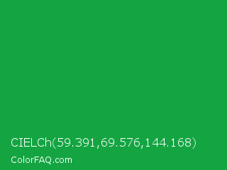 CIELCh 59.391,69.576,144.168 Color is a normal green color and the nearest color is Green Pantone #00ad43. Hex code #14a542 and RGB value is rgb(20,165,66). In RGB color space, this color is composed of 8% red, 65% green, 26% blue, In CMYK color space, this color is composed of 88% cyan, 0% magenta, 60% yellow , 35% black , In HSL color space, this color has a hue angle of 139° , 78% saturation and 36% lightness.