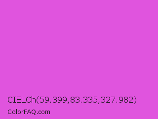 CIELCh 59.399,83.335,327.982 Color is a normal magenta color and the nearest color is Orchid #da70d6. Hex code #e054de and RGB value is rgb(224,84,222). In RGB color space, this color is composed of 88% red, 33% green, 87% blue, In CMYK color space, this color is composed of 0% cyan, 63% magenta, 1% yellow , 12% black , In HSL color space, this color has a hue angle of 301° , 69% saturation and 60% lightness.