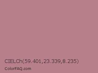 CIELCh 59.401,23.339,8.235 Color is a light red color and the nearest color is Brandy Rose #bb8983. Hex code #b8808a and RGB value is rgb(184,128,138). In RGB color space, this color is composed of 72% red, 50% green, 54% blue, In CMYK color space, this color is composed of 0% cyan, 30% magenta, 25% yellow , 28% black , In HSL color space, this color has a hue angle of 349° , 28% saturation and 61% lightness.