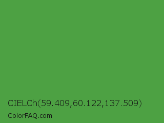 CIELCh 59.409,60.122,137.509 Color is a normal green color and the nearest color is Apple #4fa83d. Hex code #4da143 and RGB value is rgb(77,161,67). In RGB color space, this color is composed of 30% red, 63% green, 26% blue, In CMYK color space, this color is composed of 52% cyan, 0% magenta, 58% yellow , 37% black , In HSL color space, this color has a hue angle of 114° , 41% saturation and 45% lightness.
