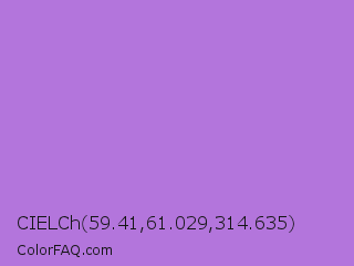 CIELCh 59.41,61.029,314.635 Color is a light purple color and the nearest color is Lavender #b57edc. Hex code #b375dc and RGB value is rgb(179,117,220). In RGB color space, this color is composed of 70% red, 46% green, 86% blue, In CMYK color space, this color is composed of 19% cyan, 47% magenta, 0% yellow , 14% black , In HSL color space, this color has a hue angle of 276° , 60% saturation and 66% lightness.